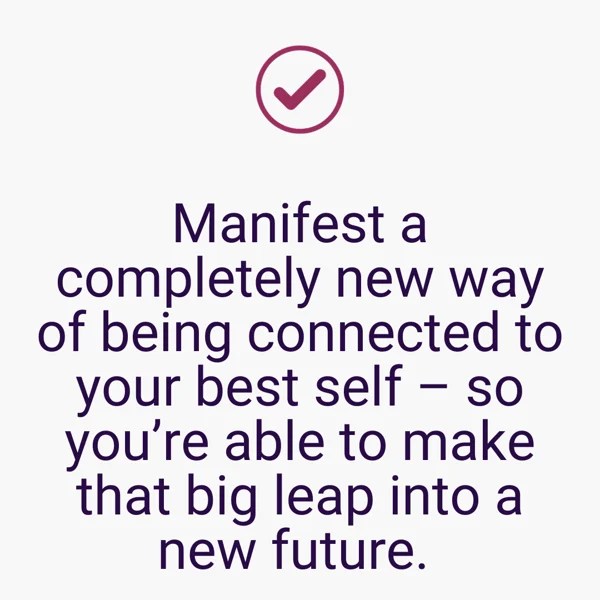 You embody a new self-concept, anchor your future identity, and lock in aligned behaviour through visioning, manifestation, and commitment. You are no longer “trying” to become someone new – you are her.